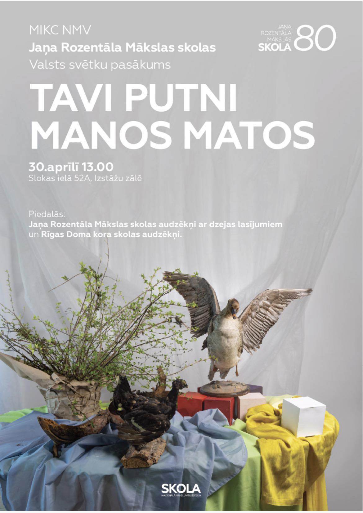 Aicinām uz MIKC NMV Jaņa Rozentāla Mākslas skolas valsts svētku pasākumu “Tavi putni manos matos” 30. aprīlī plkst. 13.00 Slokas ielā 52A, Izstāžu zālē.